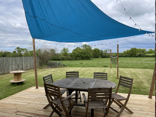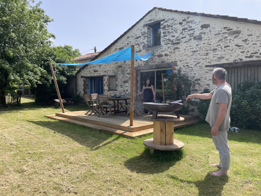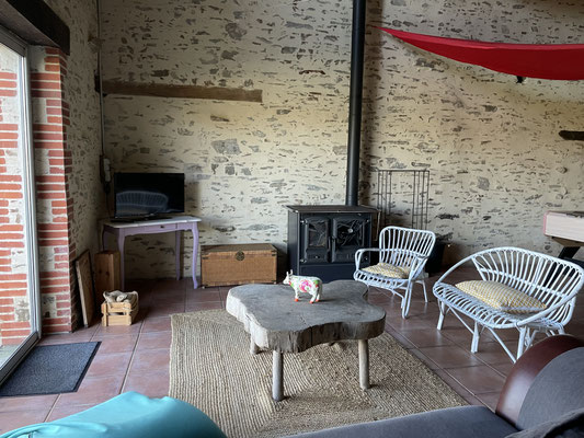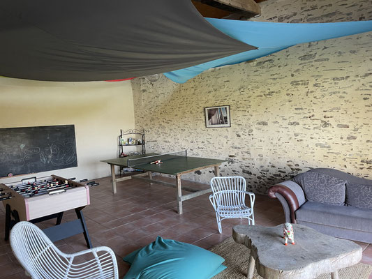 La grande grange attenante est multifonctions : vous pourrez y jouer (babyfoot, table de ping-pong, jeux de société...), vous reposer dans le coin salon (+TV). Vous aurez directement accès au jardin avec vue dégagée sur la campagne. Une terrasse privée avec salon de jardin, transats et brasero sont à votre disposition.