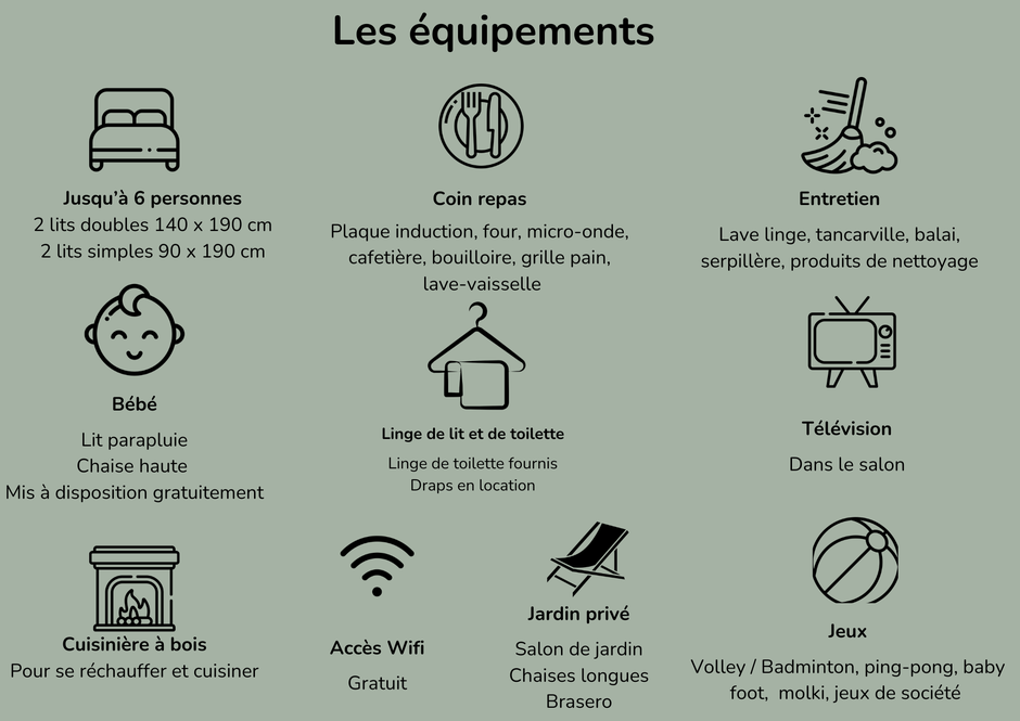 De plein pied, vous accèderez directement dans la pièce de vie et la cuisine entièrement équipée (four, réfrigérateur, cafetière, bouilloire, lave-vaisselle, micro-ondes, plaque induction et lave-linge). Vous disposerez de nombreux rangements, vaisselles et accessoires pour préparer vos repas.