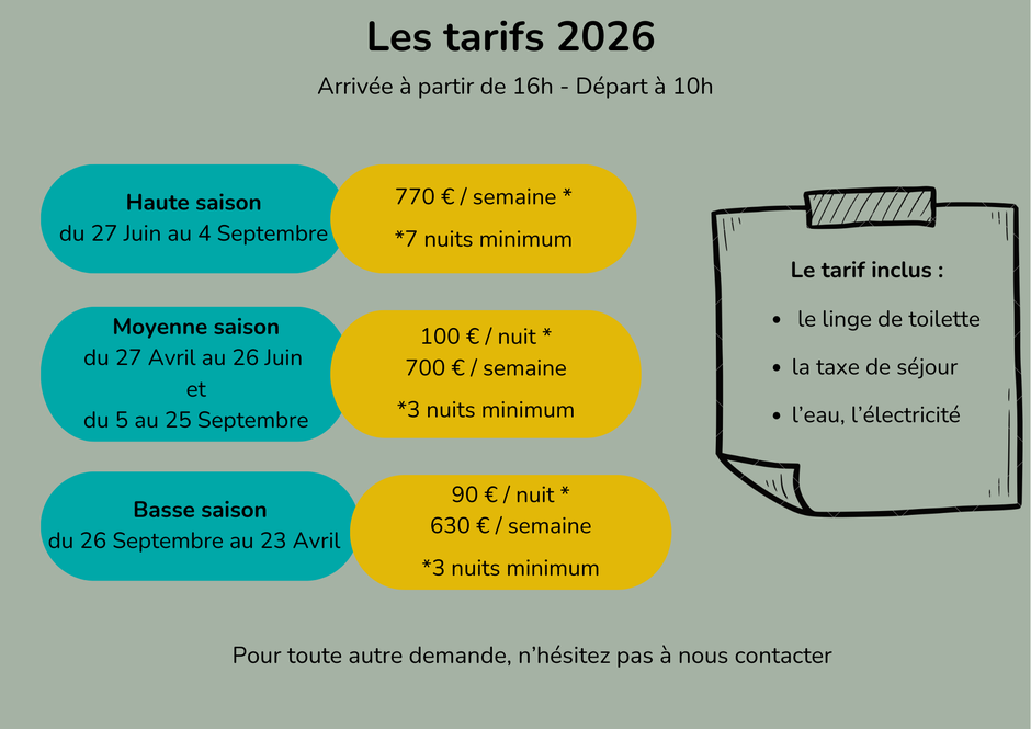 Les 1ers mois de l'année 2026 seront quelque peu chamboulés car nous allons accueillir notre 1er enfant. Le planning a donc été bloqué les mois de février et mars. Si vous souhaitez réserver durant cette période, nous pourrons étudier votre demande et voir ensemble si nous pouvons vous accueillir dans notre gîte.